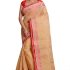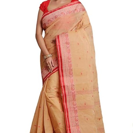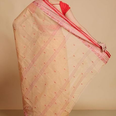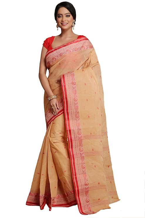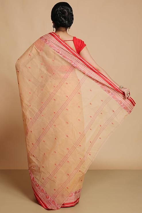 Dailyware bengal cotton tant saree beige with red threads buti design in all over body with designer threads border.