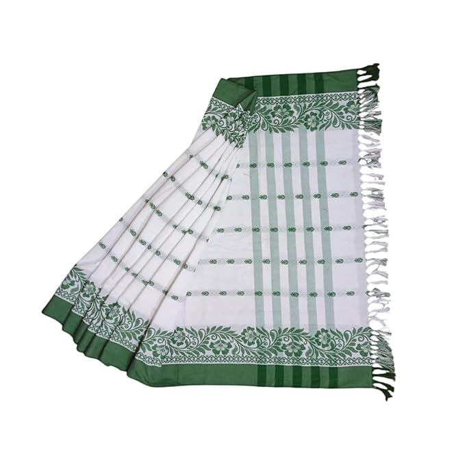 Traditional Cotton Adivasi Saree, White with Green Border, 5.5 Metres.